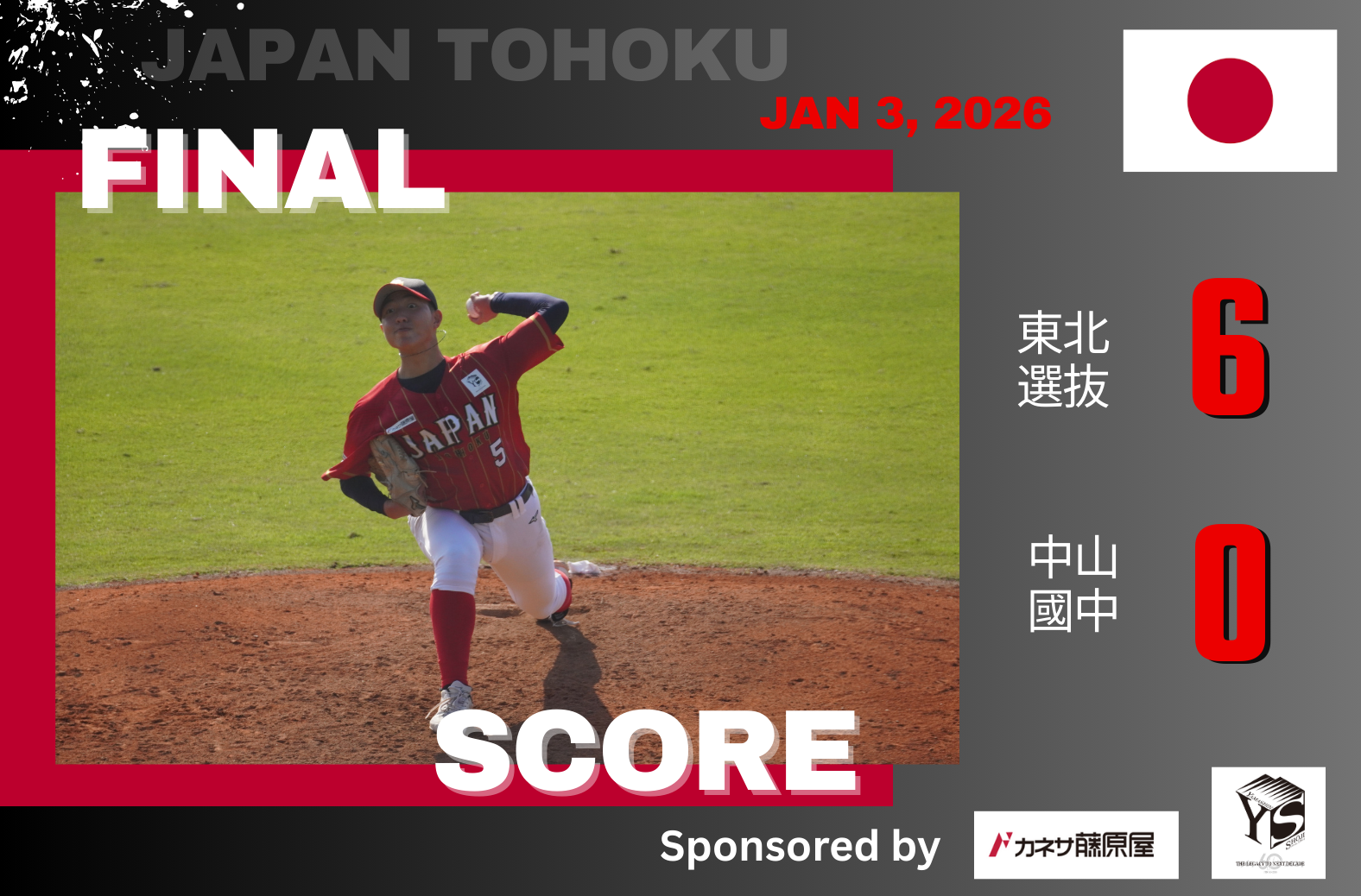 | 東北選抜 | 0 | 0 | 0 | 3 | 1 | 2 | 0 | 6 |