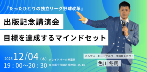 「たったひとりの独立リーグ野球改革 出版記念講演会」では、元プロ野球選手でもなかった一人の若者が、野球とビジネスの両輪で道を切り開いてきたストーリーが語られます。